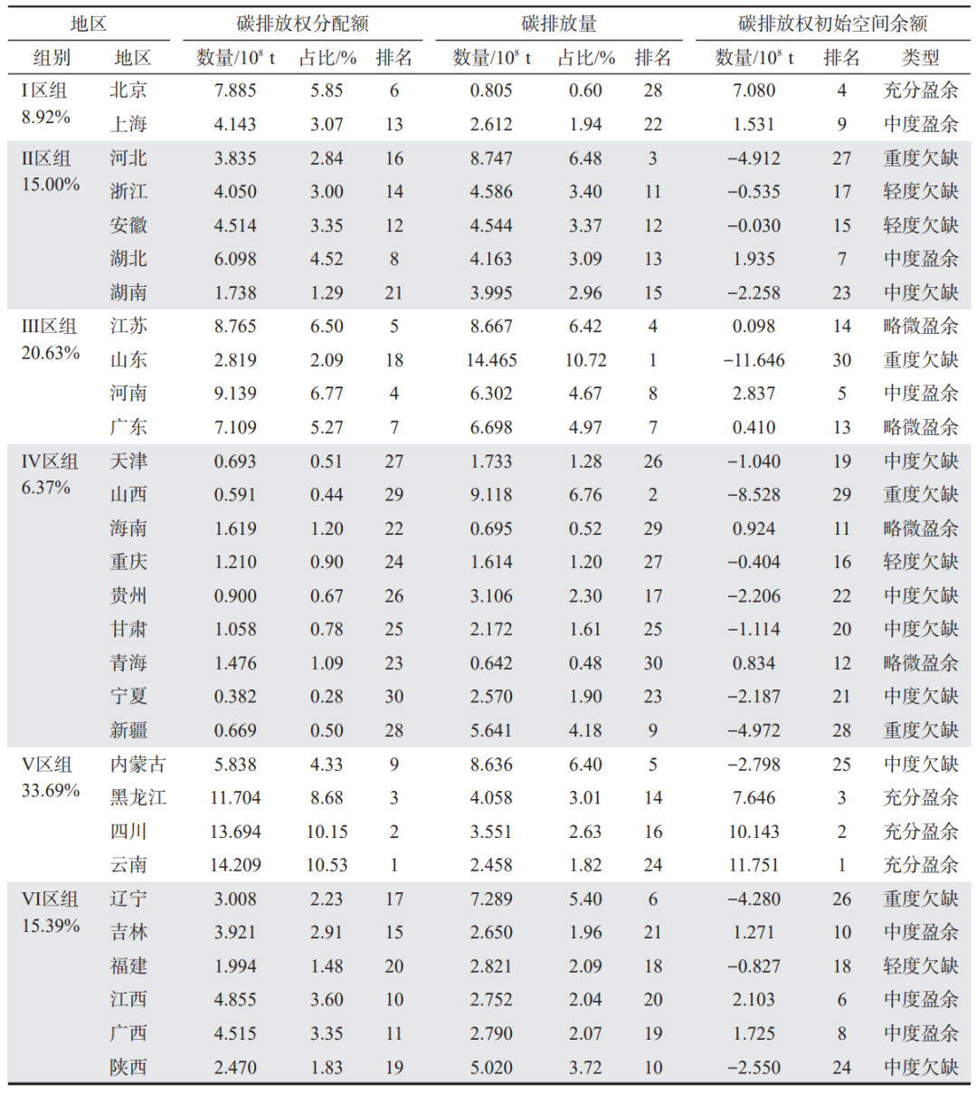有鑒于減排工作重要性的不斷凸現,近年來有不少學者立足于中國碳排放問題展開深度探討。通過對文獻梳理,作者發現目前關于中國碳排放問題的研究已較為系統,基本涵蓋了各個方面,所得出的相關結論也為逐步完善我國碳排放抑或碳減排問題的研究體系奠定了堅實基礎。但同時,現有研究也存在著一定不足,重點體現在兩個方面:一是雖然也有學者探討過碳排放權的省域分配問題,但在指標體系的構建上卻更傾向于各類社會經濟指標,而忽視了以林業、農業等為代表的生態功能指標。二是在完成碳排放權省域分配之后,對表現出欠缺特征的地區缺少深度分析。正是基于此,文章重新構建碳排放權區域分配指標體系,并以此為基礎完成碳排放權的省域分配;然后從中識別出碳排放權初始空間余額欠缺地區并對各自碳減排潛力進行綜合評估。