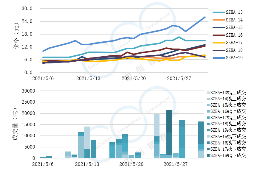 • 線上成交價最低為4.39(產品SZEA-18),最高為25.99元(產品SZEA-19),平均碳價為10.08元(平均碳價為各產品價格加權得出)。