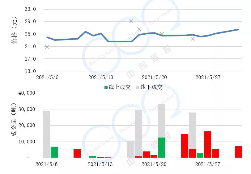 • 線下成交價最低為20.80元,最高為29.15元,平均碳價為24.99元。